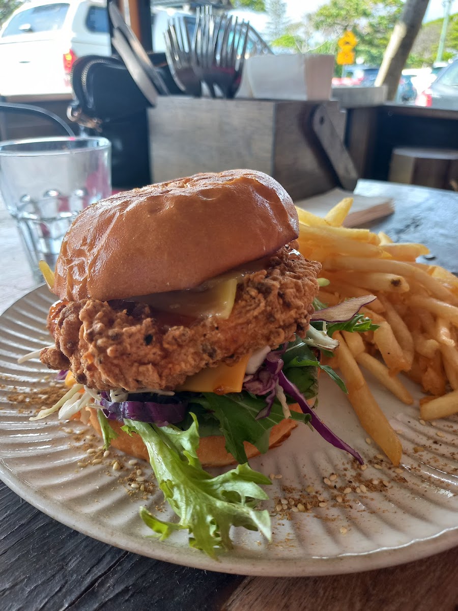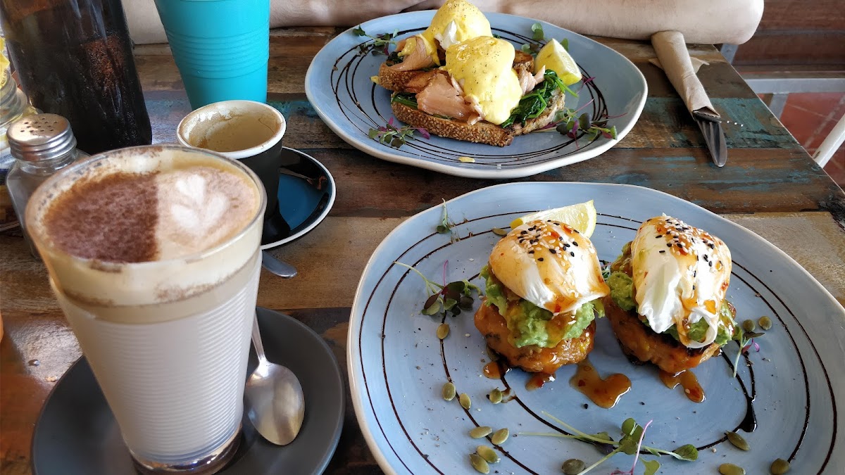 The menu isn’t your standard eggs-and-toast lineup. Offerings such as eggs Benedict and a prawn egg scramble show the kitchen’s twist on breakfast classics. The variety extends through the day with dishes like Southern chicken burgers, sweet potato and corn fritters, and Vietnamese sticky beef salad, catering to both those after a hearty meal and lighter options. It’s a place where eggs and avo on toast live comfortably alongside crumbed barramundi and salt and pepper calamari, hinting at the coastal location by focusing on fresh, satisfying flavors.